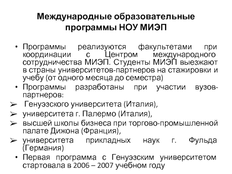 Порядок работы: Студенты отправляются в вуз-партнер на один семестр с перезачетом результатов учебы посредством валидации.