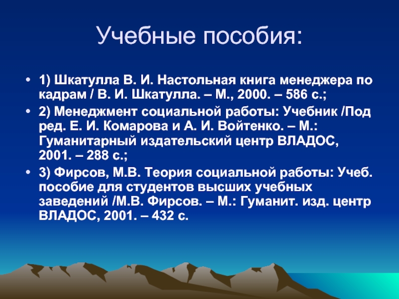 2) Менеджмент социальной работы: Учебник /Под ред. Е. И. Комарова и А. И. Войтенко. – М.: Гуманитарный издательский центр ВЛАДОС, 2001. – 288 с.;