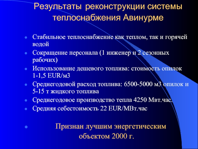 Слайд 24Результаты реконструкции системы теплоснабжения Авинурме