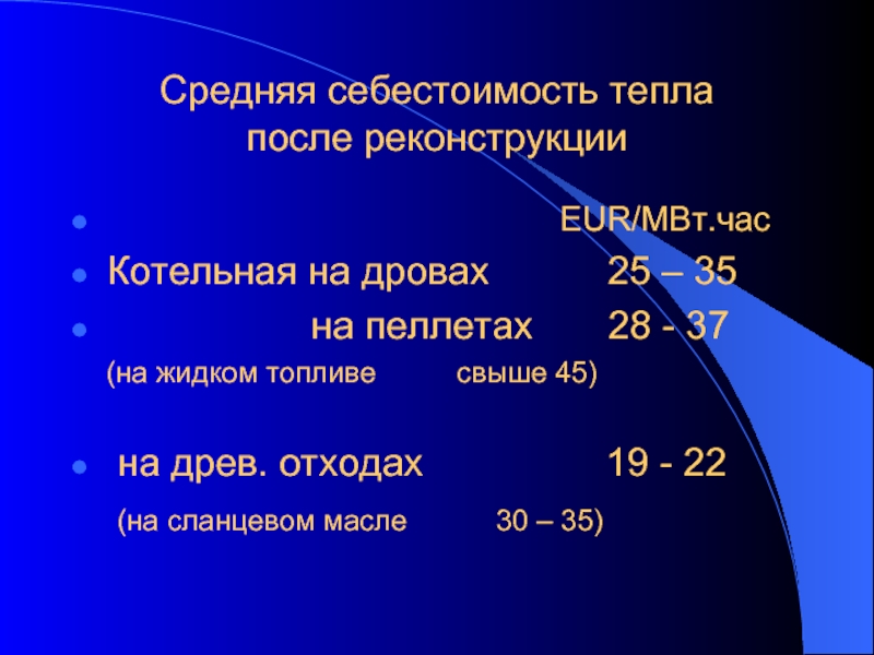 - на древесных отходах и щепе 160 – 250 EUR/КВт