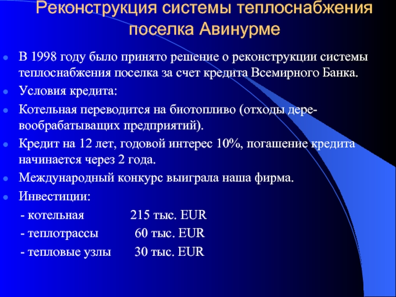 реконструкции системы теплоснабжения поселка за счет кредита Всемирного Банка.