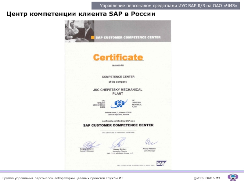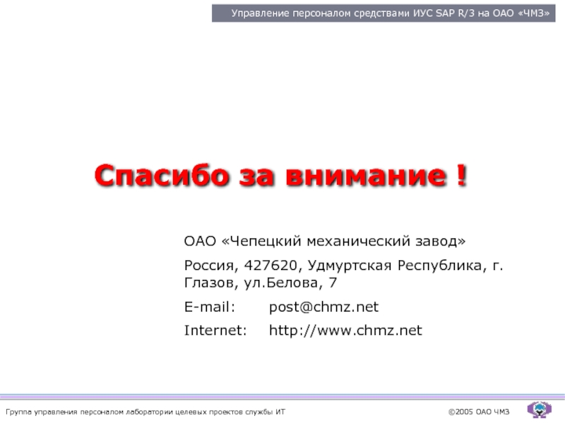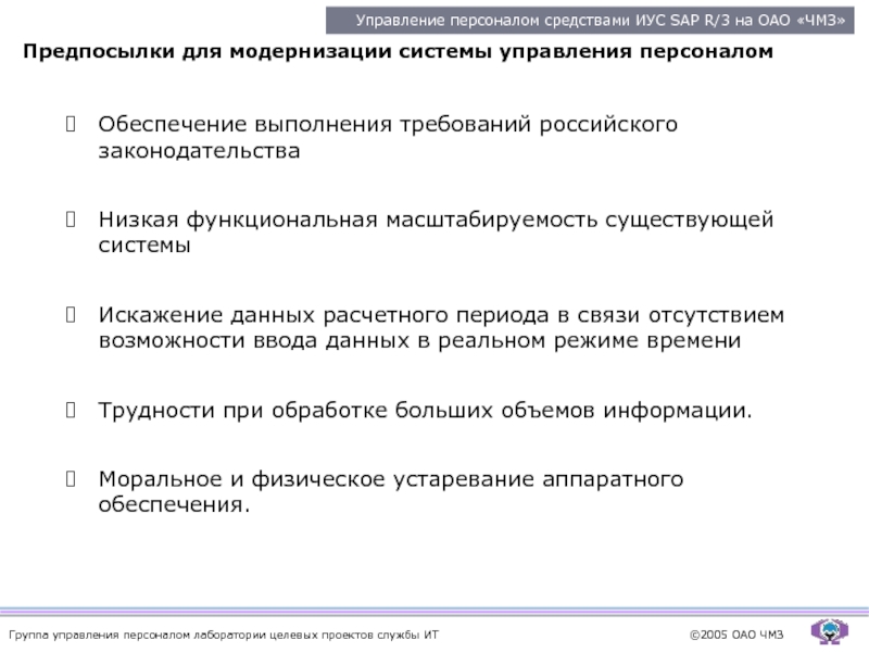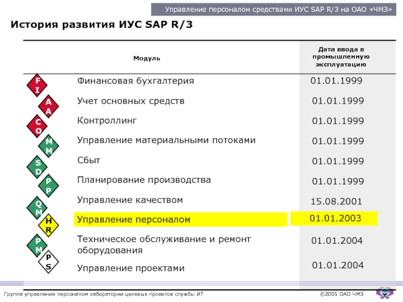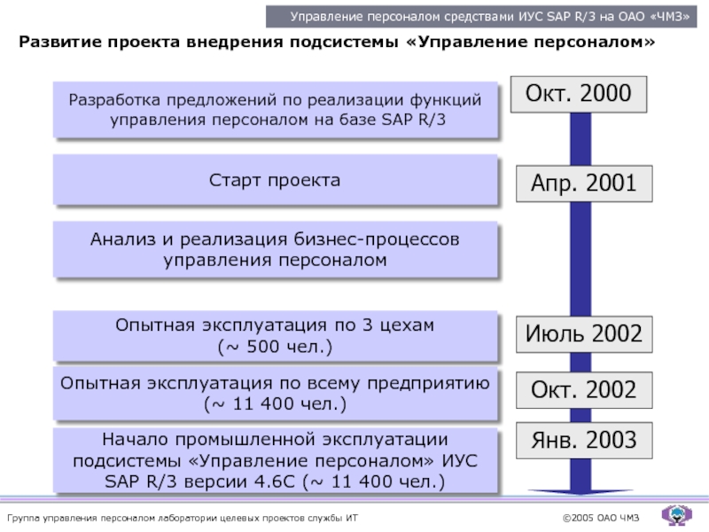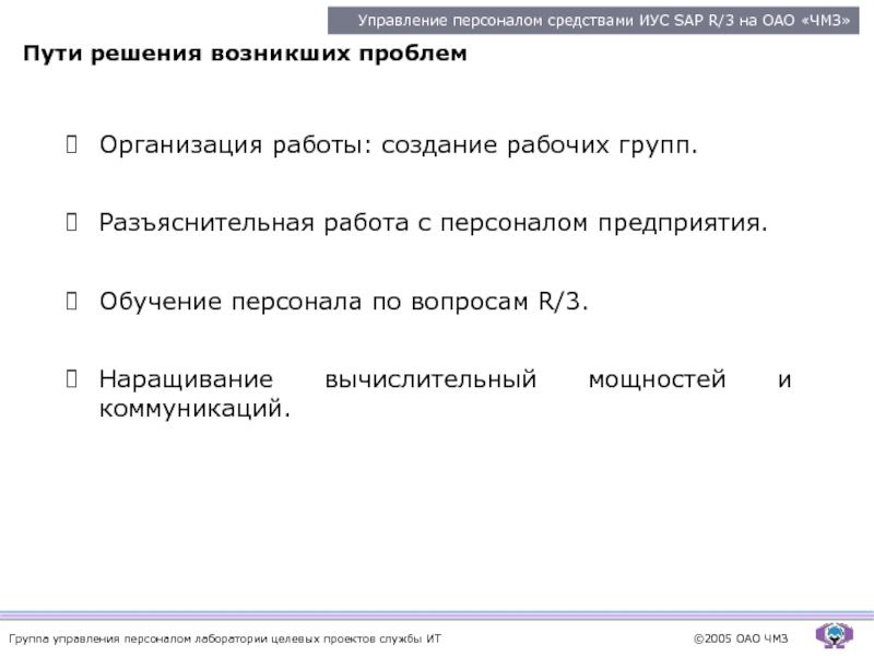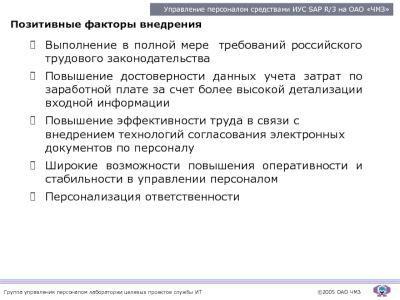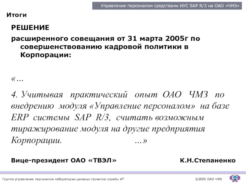 4. Учитывая практический опыт ОАО ЧМЗ по внедрению модуля «Управление персоналом» на базе ERP системы SAP R/3, считать возможным тиражирование модуля на другие предприятия Корпорации. …»
