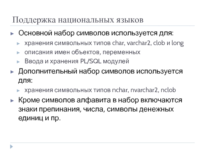 В одной БД могут использоваться два набора символов: основной (database character set) и дополнительный (national character set)