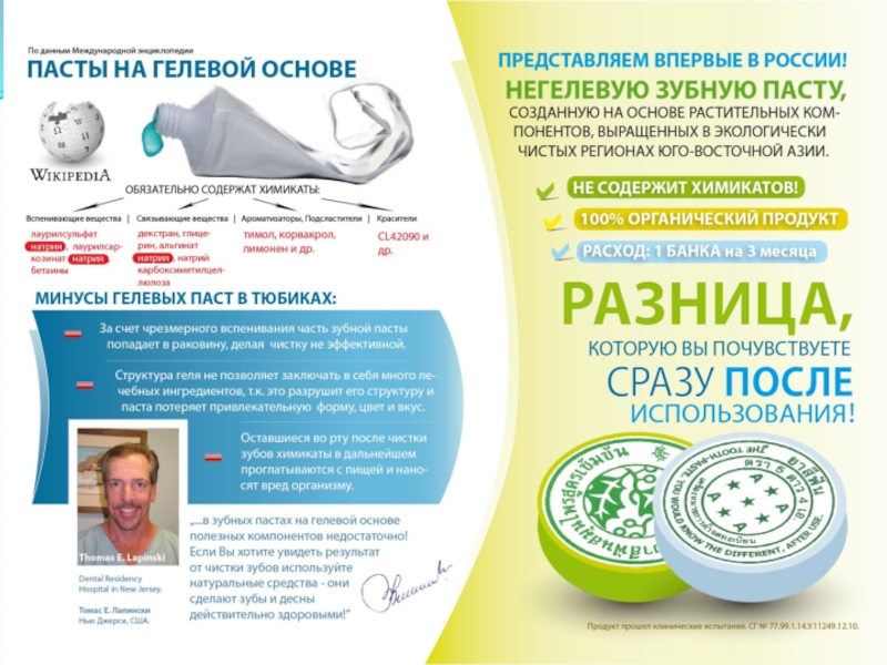 Благодарим Вас за интерес к нашему товару! Представляем Вашему вниманию новую форму зубной пасты, созданную исключительно из натуральных компонентов на основе четырех растительных масел. Страна производитель - Таиланд. Наша компания имеет разрешительную документацию для реализации данной продукции на территории России, Казахстана и Белорусии, а также является эксклюзивным дистрибьютором на территории России. Документы прилагаются.
