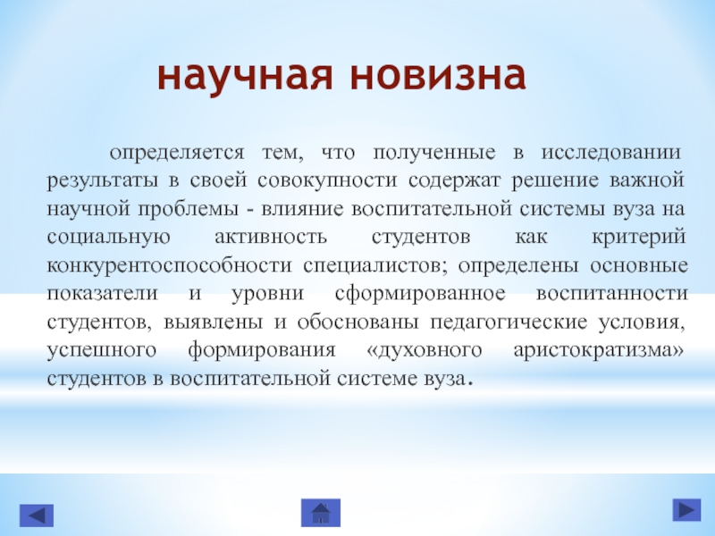 своей совокупности содержат решение важной научной проблемы - влияние воспитательной системы вуза на социальную активность студентов как критерий конкурентоспособности специалистов; определены основные показатели и уровни сформированное воспитанности студентов, выявлены и обоснованы педагогические условия, успешного формирования «духовного аристократизма» студентов в воспитательной системе вуза.