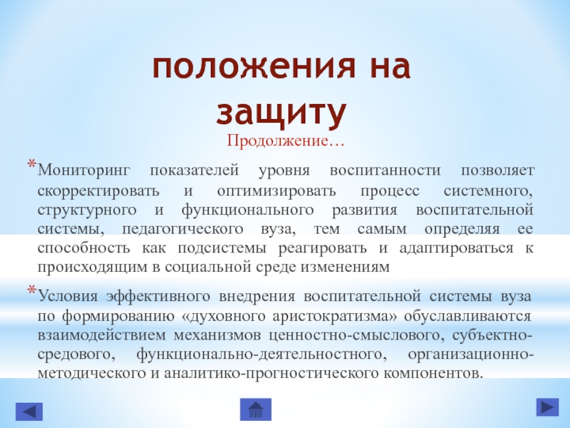 Условия эффективного внедрения воспитательной системы вуза по формированию «духовного аристократизма» обуславливаются взаимодействием механизмов ценностно-смыслового, субъектно-средового, функционально-деятельностного, организационно-методического и аналитико-прогностического компонентов.