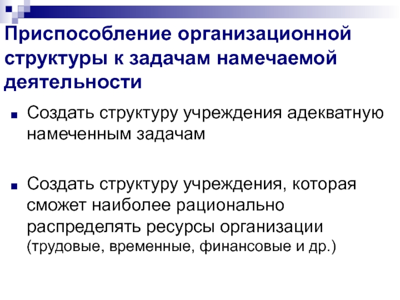 Слайд 13Приспособление организационной структуры к задачам намечаемой деятельности