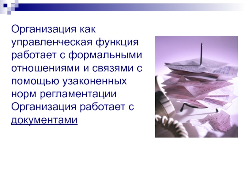 Слайд 6Организация как управленческая функция работает с формальными отношениями и связями с
