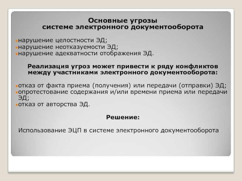 Реализация угроз может привести к ряду конфликтов между участниками электронного документооборота: