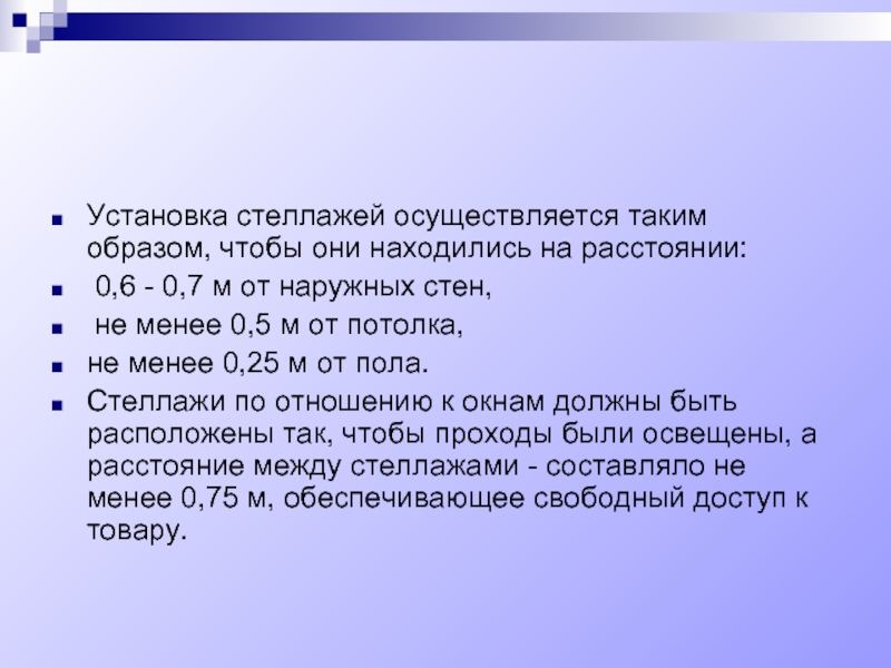Стеллажи по отношению к окнам должны быть расположены так, чтобы проходы были освещены, а расстояние между стеллажами - составляло не менее 0,75 м, обеспечивающее свободный доступ к товару.