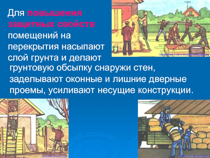 грунтовую обсыпку снаружи стен, заделывают оконные и лишние дверные проемы, усиливают несущие конструкции.
