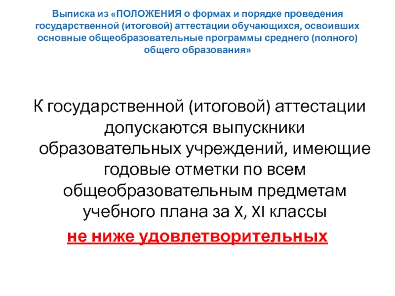 К государственной (итоговой) аттестации допускаются выпускники образовательных учреждений, имеющие годовые отметки по всем общеобразовательным предметам учебного плана за X, XI классы