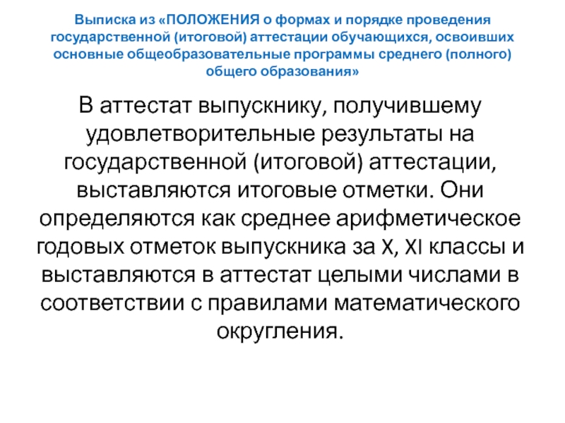 В аттестат выпускнику, получившему удовлетворительные результаты на государственной (итоговой) аттестации, выставляются итоговые отметки. Они определяются как среднее арифметическое годовых отметок выпускника за X, XI классы и выставляются в аттестат целыми числами в соответствии с правилами математического округления.