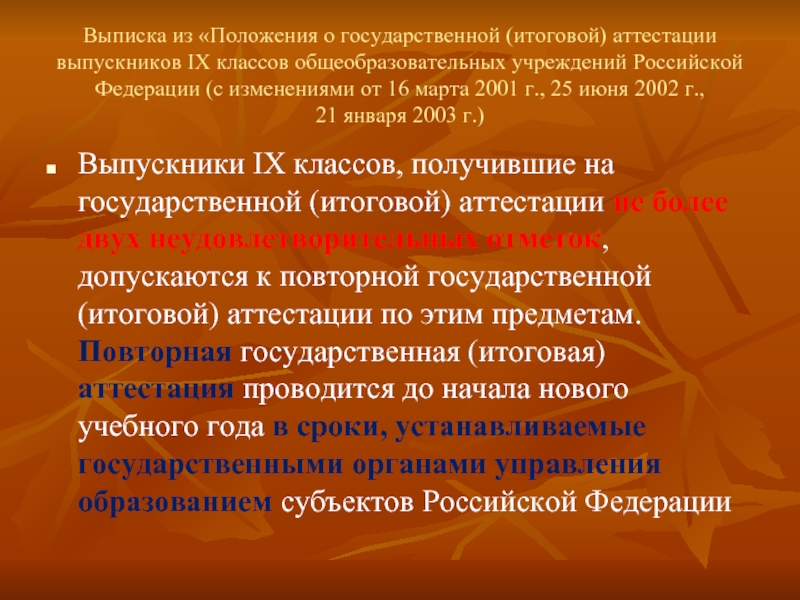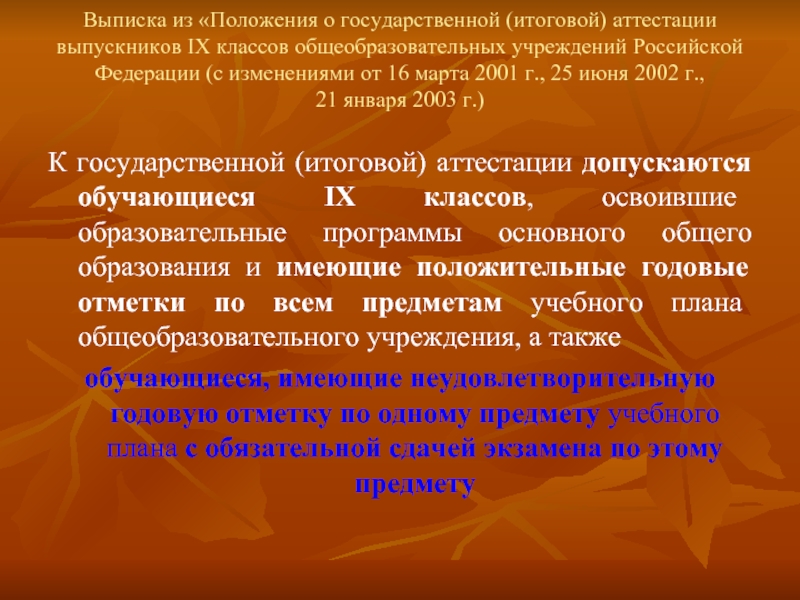 Слайд 6Выписка из «Положения о государственной (итоговой) аттестации выпускников IX классов общеобразовательных