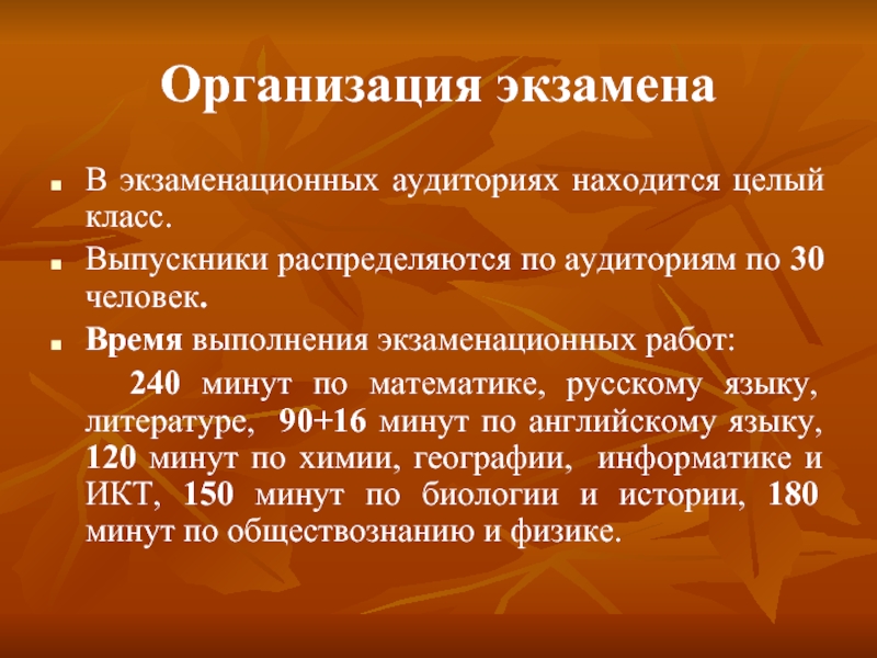 240 минут по математике, русскому языку, литературе, 90+16 минут по английскому языку, 120 минут по химии, географии, информатике и ИКТ, 150 минут по биологии и истории, 180 минут по обществознанию и физике.