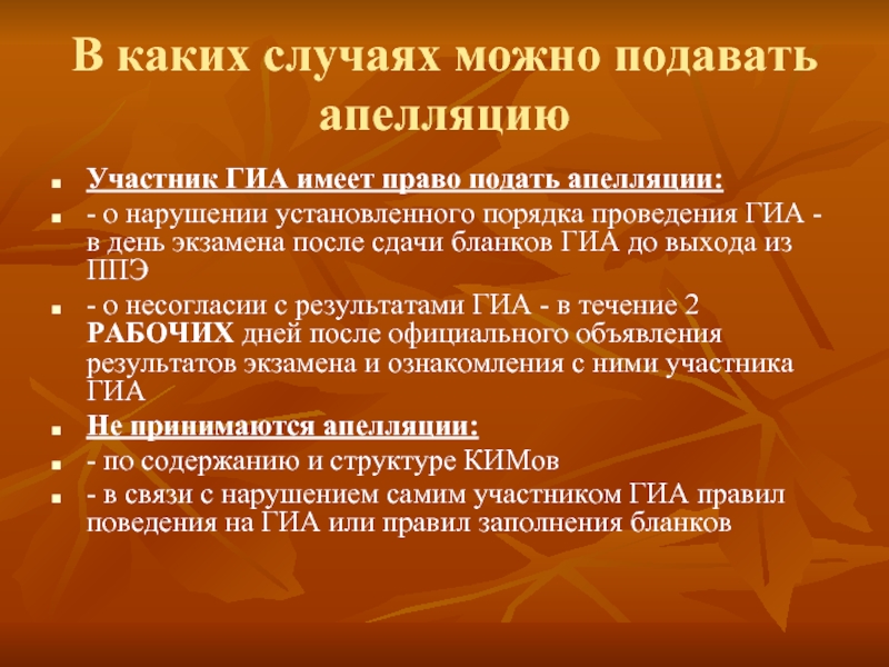 о нарушении установленного порядка проведения ГИА - в день экзамена после сдачи бланков ГИА до выхода из ППЭ