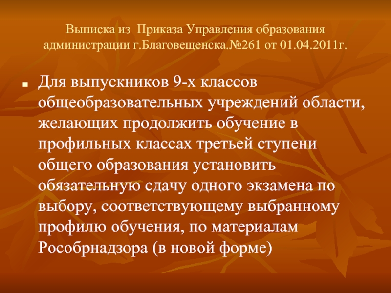 Слайд 9Выписка из Приказа Управления образования администрации г.Благовещенска.№261 от 01.04.2011г.