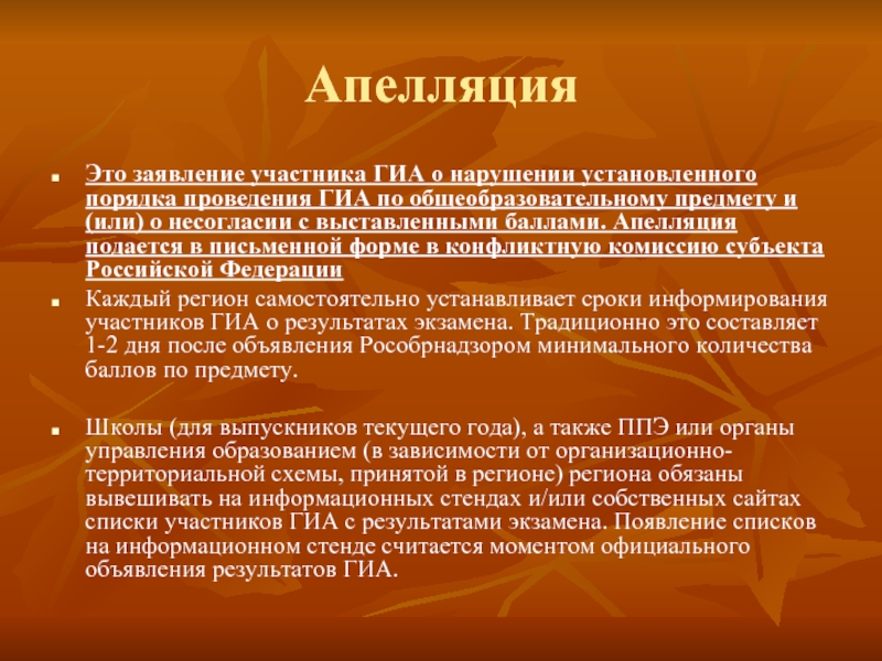 общеобразовательному предмету и (или) о несогласии с выставленными баллами. Апелляция подается в письменной форме в конфликтную комиссию субъекта Российской Федерации