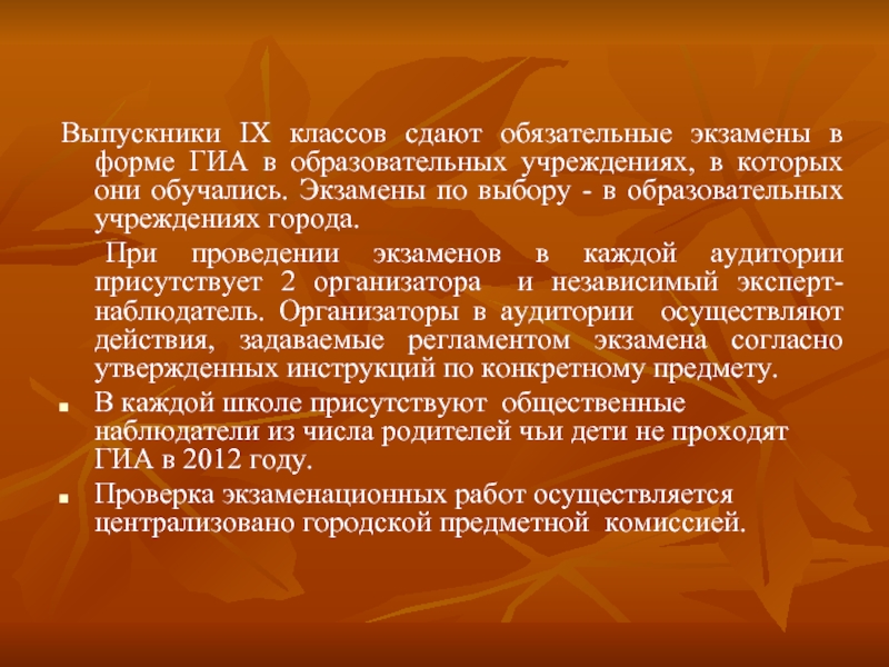 Выпускники IX класса общеобразовательного учреждения сдают не менее 4-х экзаменов: письменные экзамены по русскому языку и математике, а также два экзамена по выбору выпускника из числа предметов, изучавшихся в IX классе.