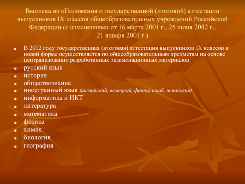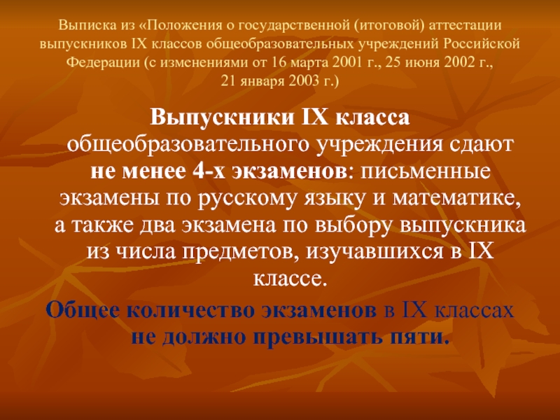 Слайд 5Выписка из «Положения о государственной (итоговой) аттестации выпускников IX классов общеобразовательных