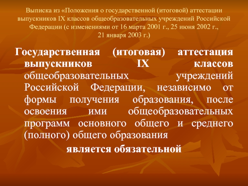 Слайд 4Выписка из «Положения о государственной (итоговой) аттестации выпускников IX классов общеобразовательных