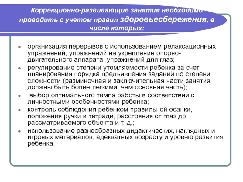 Коррекционно-развивающие занятия необходимо проводить с учетом правил здоровьесбережения, в числе которых: