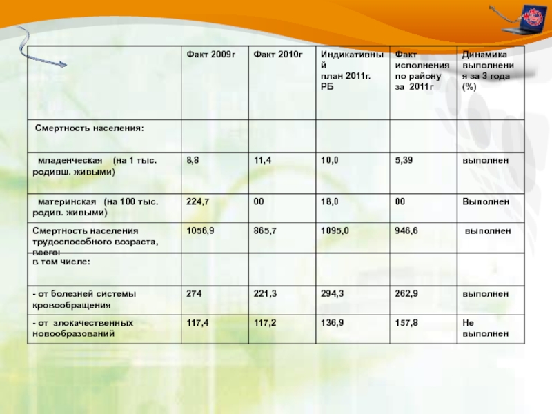 соответствии с Постановлением Правительства РБ №176 от 18.04.2011года « Об индикативном плане Правительства Республики Бурятия » по реализации Закона республики Бурятия на 2011-2015 годы» по разделу здравоохранение в редакции Постановления Правительства РБ № 381 от 22.07.2011г., № 404 от 04.08.2011года по Баргузинскому районуза 2009г-2010г -2011г (оперативные данные за 2011г)