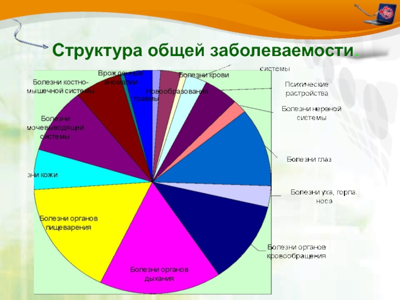 снижением в сравнении с предыдущим годом на 15% и составляет 54243,6 на 100тыс. населения. В структуре первичной заболеваемости в 2011г. (слайд № ) на первом месте болезни органов дыхания - 26,6%, на втором месте – болезни органов пищеварения – 20,6%, , на третьем месте - болезни глаза и его придаточного аппарата - 9,9% , на пятом травмы и отравления – 8,0% на шестом – болезни кожи и подкожной клетчатки -9,4%, далее - болезни мочеполовой системы – 5,1%, болезни костно-мышечной системы (4,9),кровообращения (3,7), уха (3,1%).