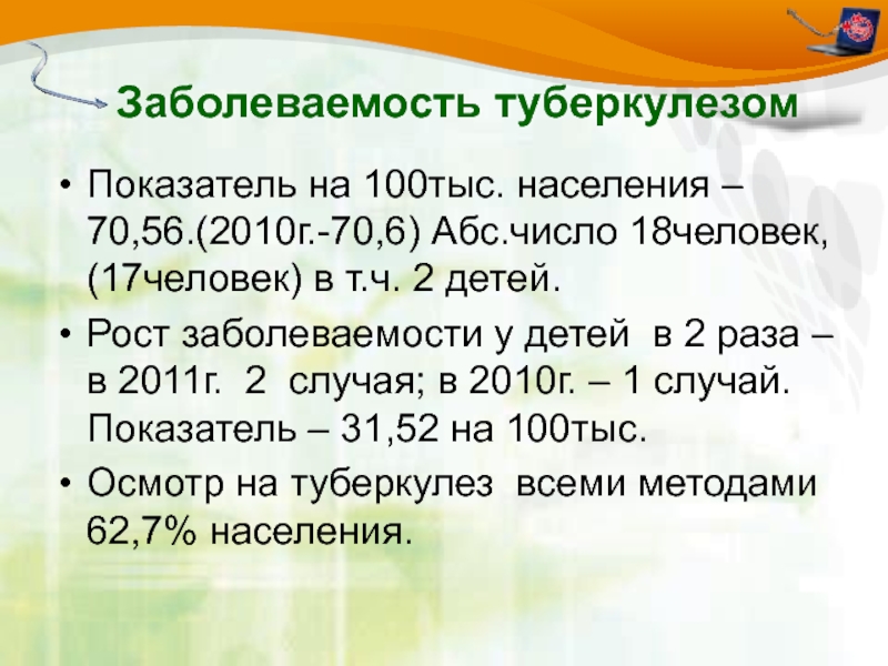 Показатель на 100тыс. населения – 70,56.(2010г.-70,6) Абс.число 18человек, (17человек) в