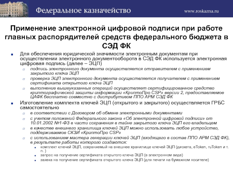 Изготовление сертификатов открытого ключа ЭЦП осуществляет Уполномоченный удостоверяющий центр Федерального казначейства, предоставляющий услуги участникам корпоративной информационной системы Федерального казначейства (ст.17 ФЗ «Об электронной цифровой подписи» от 10.01.2002 №1-ФЗ)