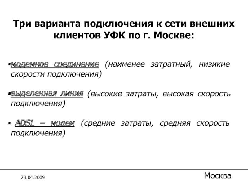 Три варианта подключения к сети внешних клиентов УФК по г. Москве: