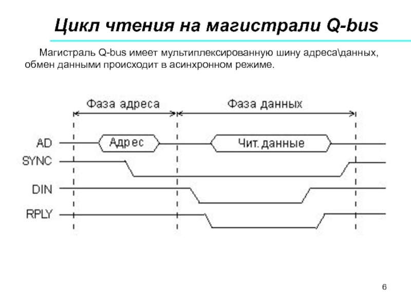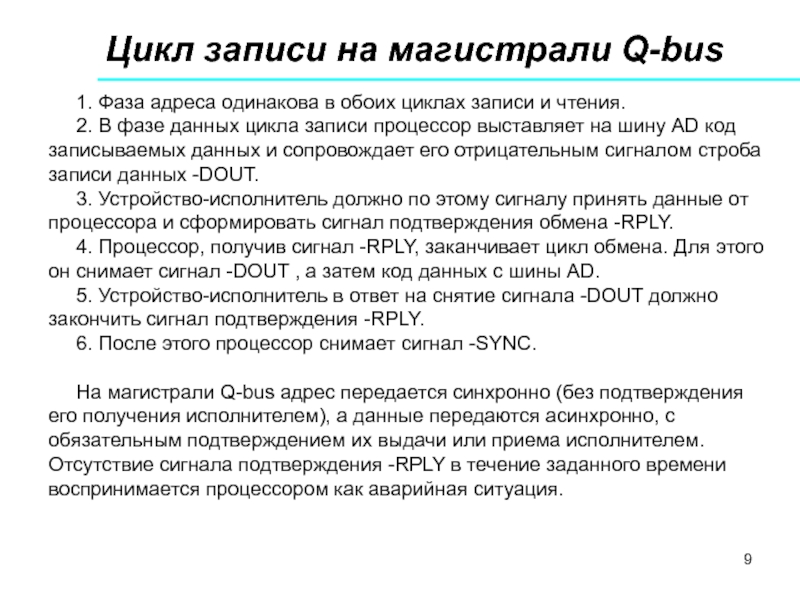 На магистрали Q-bus адрес передается синхронно (без подтверждения его получения исполнителем), а данные передаются асинхронно, с обязательным подтверждением их выдачи или приема исполнителем. Отсутствие сигнала подтверждения -RPLY в течение заданного времени воспринимается процессором как аварийная ситуация.
