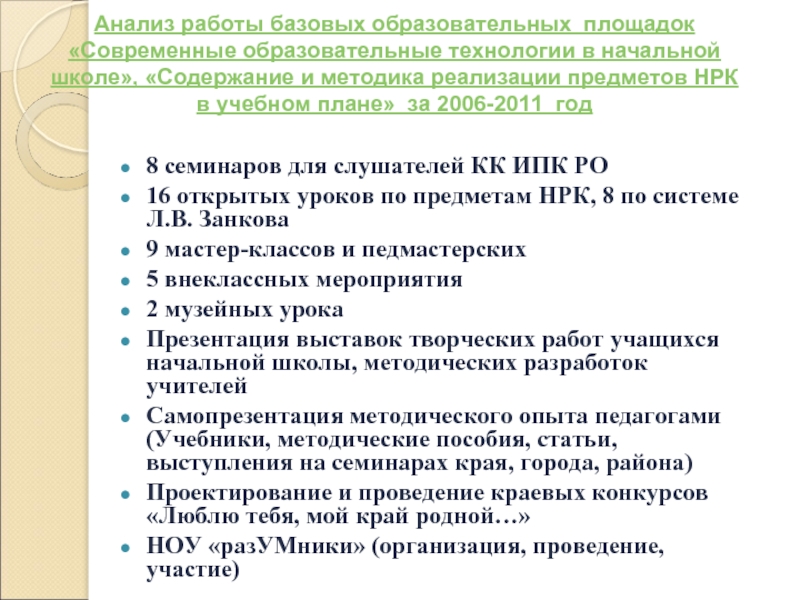 16 открытых уроков по предметам НРК, 8 по системе Л.В. Занкова