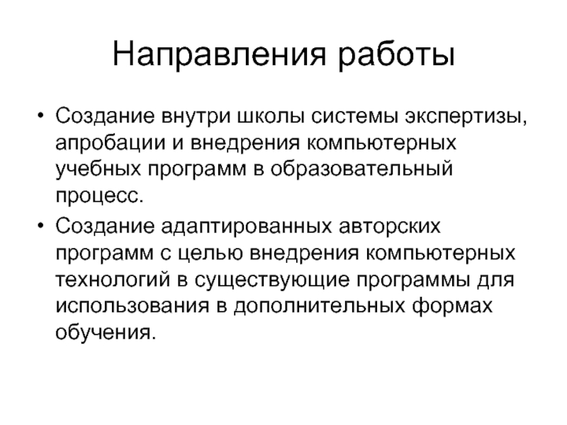 Создание адаптированных авторских программ с целью внедрения компьютерных технологий в существующие программы для использования в дополнительных формах обучения.