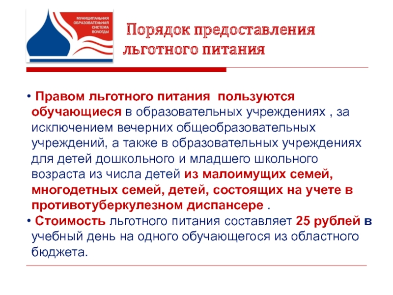 Слайд 4 Порядок предоставления льготного питания