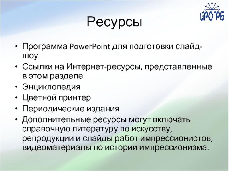 Дополнительные ресурсы могут включать справочную литературу по искусству, репродукции и слайды работ импрессионистов, видеоматериалы по истории импрессионизма.