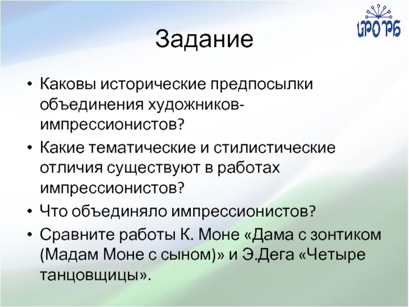 Учащиеся должны выявить общие и индивидуальные черты стиля художников-импрессионистов и решить,