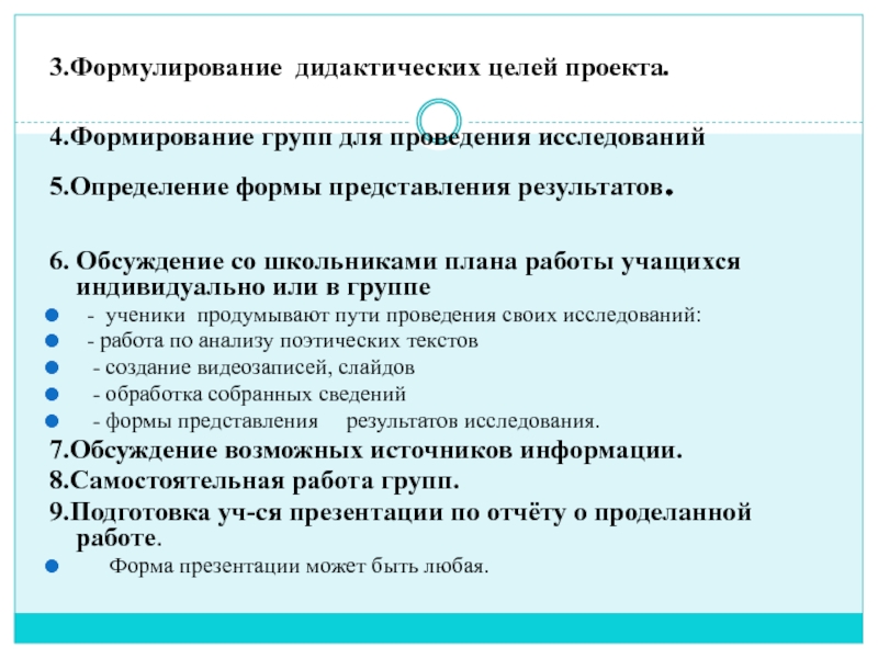 обсуждение способов оформления конечных результатов (презентаций, защиты, творческих отчётов, просмотров и пр.);