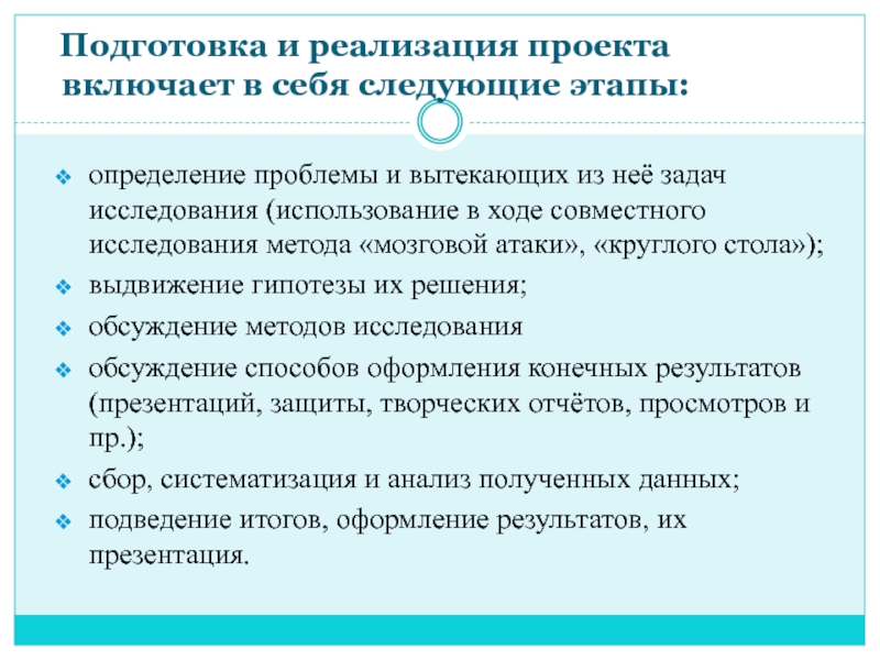 Слайд 4 Подготовка и реализация проекта включает в себя следующие этапы: