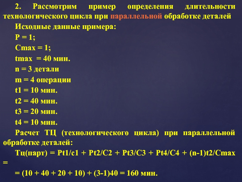 Слайд 252. Рассмотрим пример определения длительности технологического цикла при параллельной обработке деталей