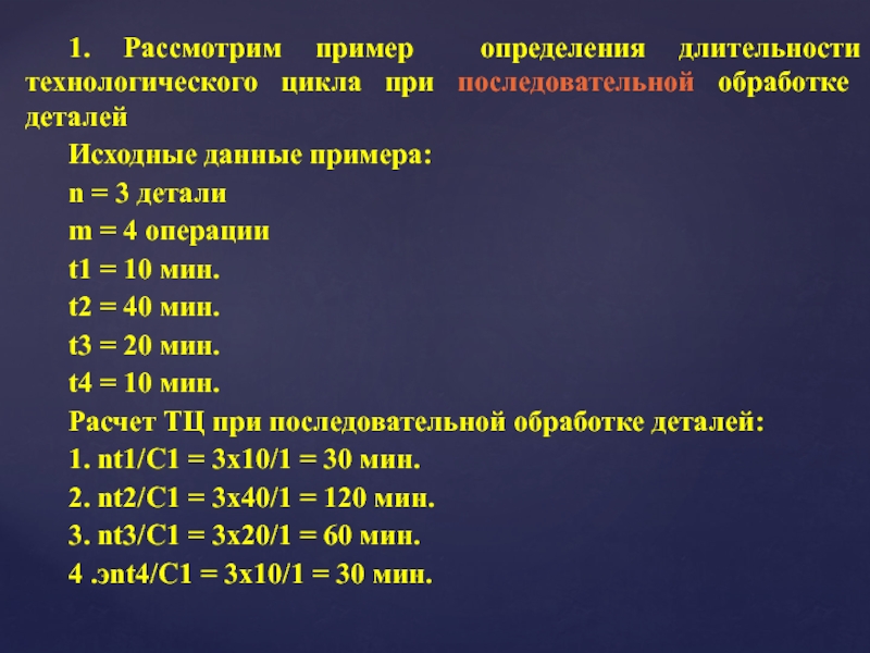 Слайд 221. Рассмотрим пример определения длительности технологического цикла при последовательной обработке деталей