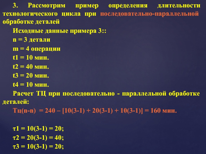 Слайд 283. Рассмотрим пример определения длительности технологического цикла при последовательно-параллельной обработке деталей