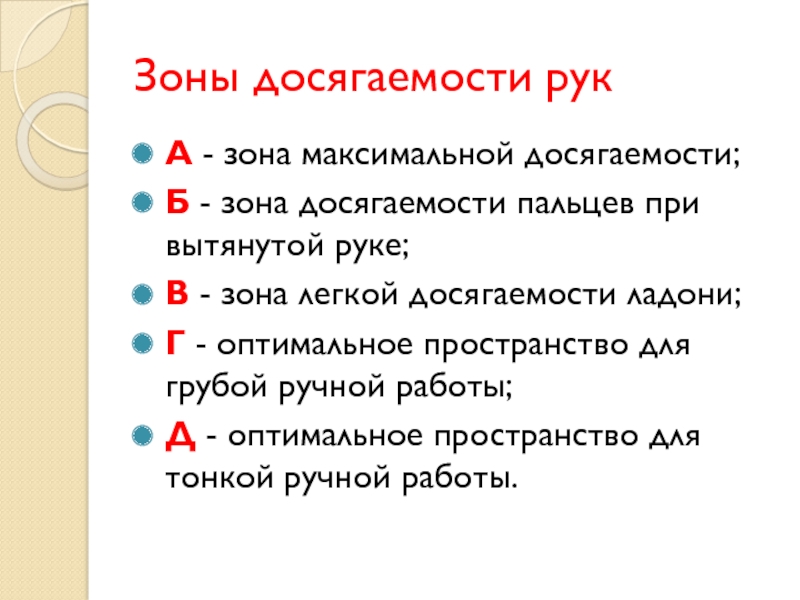 - Максимальная зона досягаемости рук - это часть моторного поля рабочего места, ограниченного дугами, описываемыми максимально вытянутыми руками при движении их в плечевом суставе.