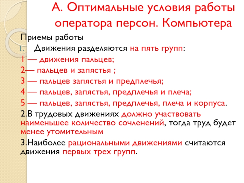 Слайд 9А. Оптимальные условия работы оператора персон. Компьютера
