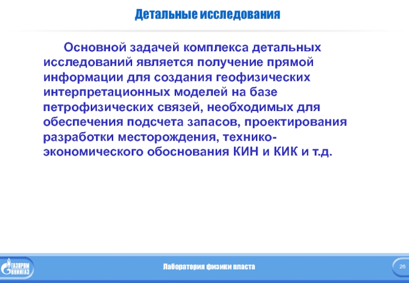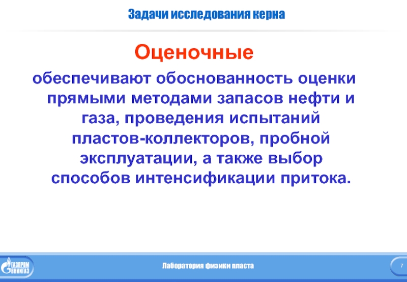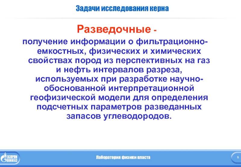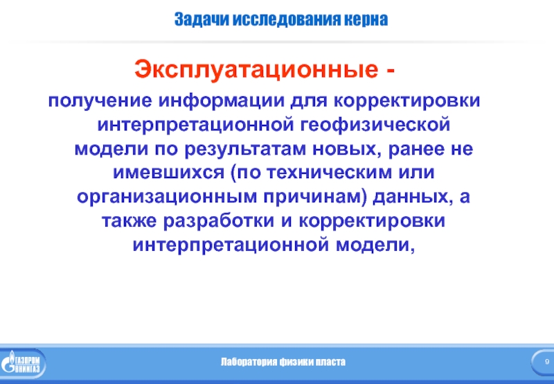 является получение прямой информации для создания геофизических интерпретационных моделей на базе петрофизических связей, необходимых для обеспечения подсчета запасов, проектирования разработки месторождения, технико-экономического обоснования КИН и КИК и т.д.