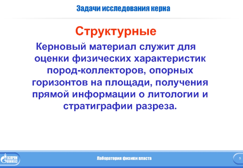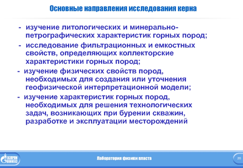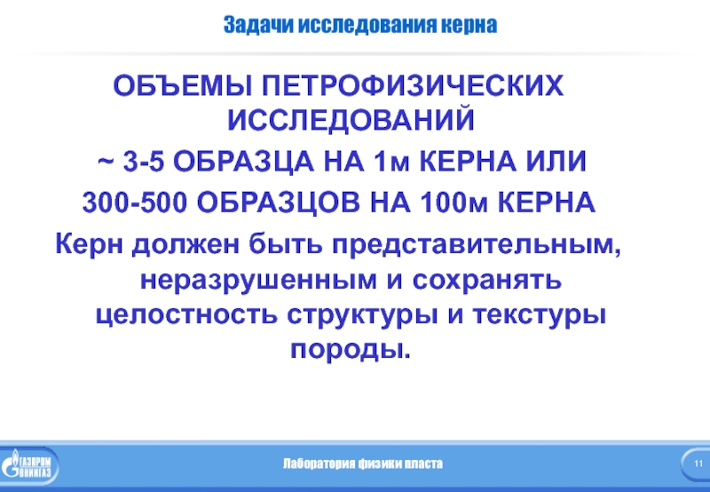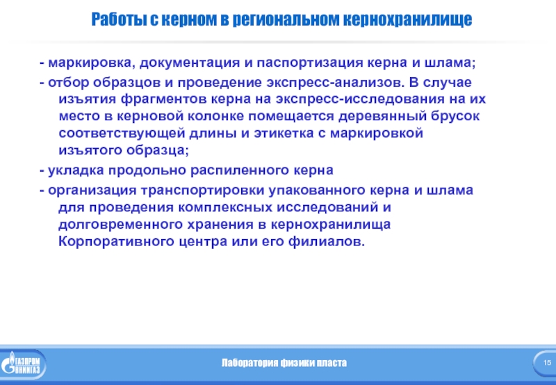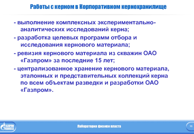 - централизованное хранение кернового материала, эталонных и представительных коллекций керна по всем объектам разведки и разработки ОАО «Газпром».