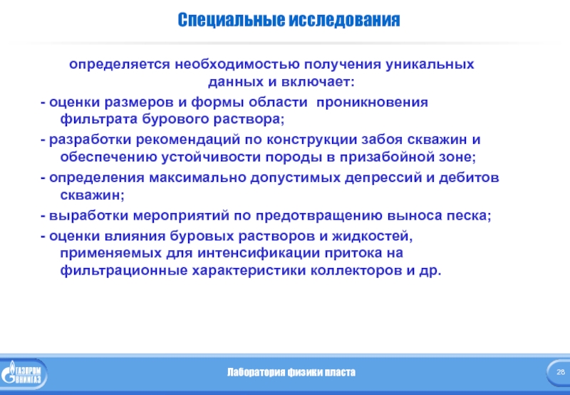 - оценки влияния буровых растворов и жидкостей, применяемых для интенсификации притока на фильтрационные характеристики коллекторов и др.