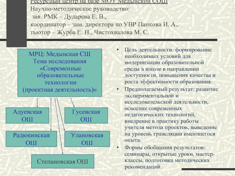 Цель деятельности: подготовка педагогических кадров, способных работать в инновационном режиме с использованием современных педагогических технологий, в том числе ИКТ.