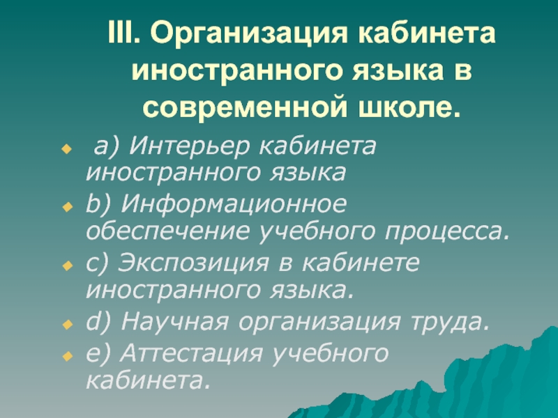 Слайд 7III. Организация кабинета иностранного языка в современной школе.