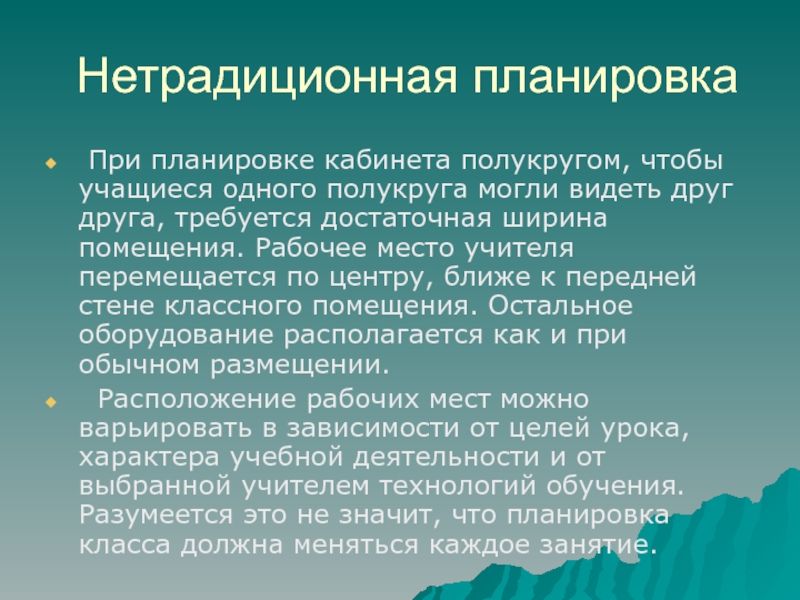 При планировке кабинета полукругом, чтобы учащиеся одного полукруга могли